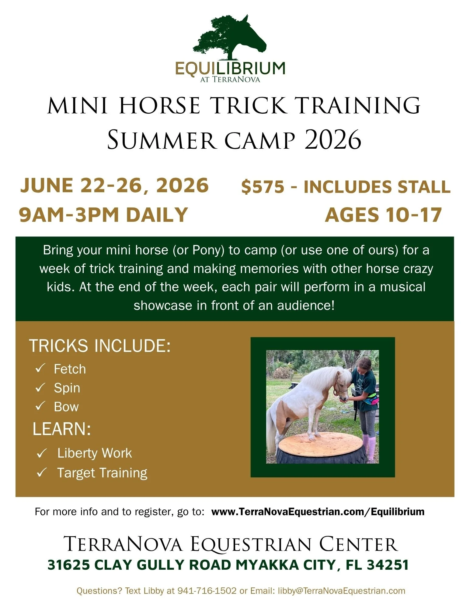 Trick Training Camp: Bring your mini horse or pony to camp (or use one of ours) for a week of trick training and making memories with other horse crazy kids! At the end of the week, each pair will perform in a musical showcase in front of an audience.